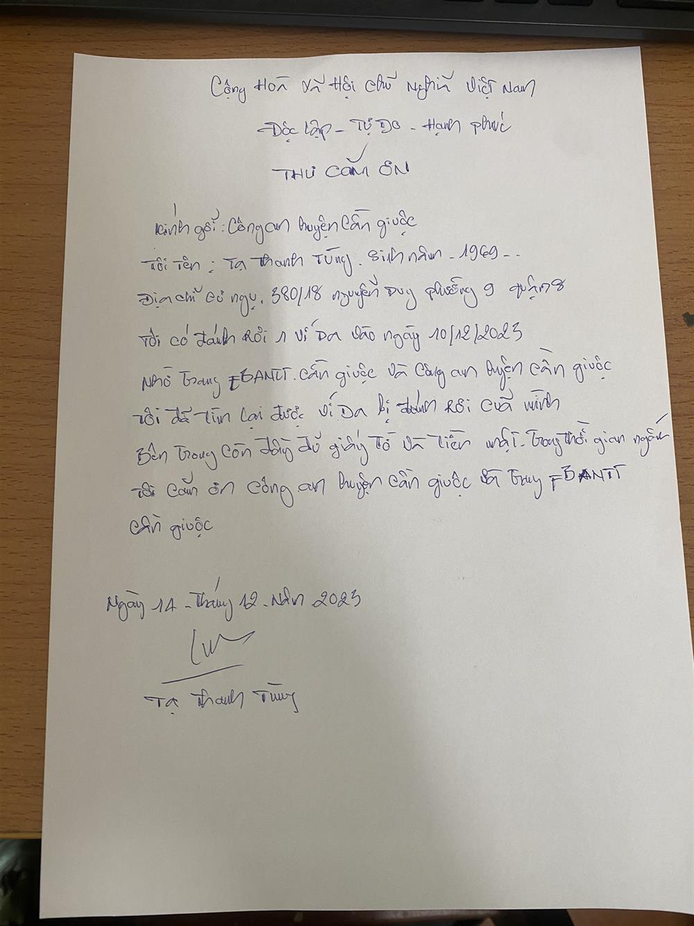 Thư cám ơn nhận lại tài sản của anh Tạ Thanh Tùng.