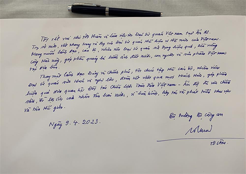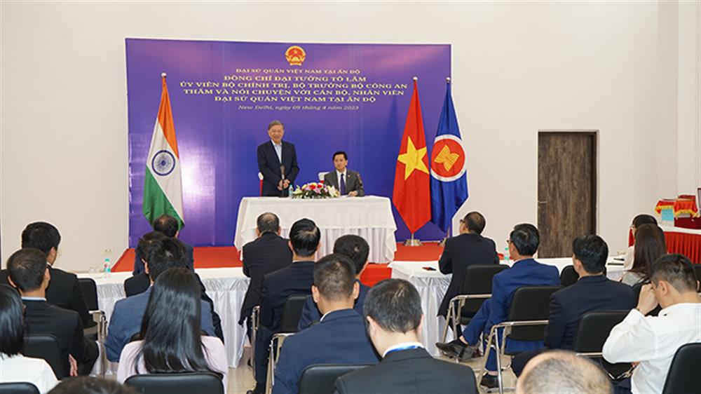 Trong khuôn khổ chuyến thăm, làm việc tại Ấn Độ theo lời mời của các cơ quan thực thi pháp luật nước sở tại, tối 09/4/2023, Đại tướng Tô Lâm, Ủy viên Bộ Chính trị, Bộ trưởng Bộ Công an và Đoàn đại biểu cấp cao Bộ Công an Việt Nam đã đến thăm và nói chuyện với cán bộ, nhân viên Đại sứ quán Việt Nam tại Cộng hòa Ấn Độ.