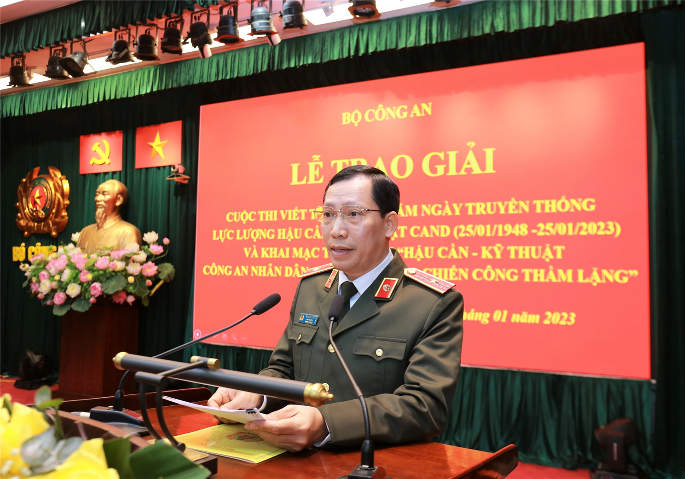 Sáng 06/01/2023, tại Hà Nội, Bộ Công an tổ chức Lễ trao giải Cuộc thi viết tìm hiểu 75 năm Ngày truyền thống lực lượng Hậu cần – Kỹ thuật Công an nhân dân (CAND) (25/01/1948 – 25/01/2023) và Khai mạc Triển lãm “Hậu cần – Kỹ thuật CAND – Dấu ấn những chiến công thầm lặng”. Thiếu tướng Lê Văn Tuyến, Thứ trưởng Bộ Công an, Trưởng Ban Chỉ đạo các hoạt động kỷ niệm 75 năm Ngày truyền thống lực lượng Hậu cần - Kỹ thuật CAND đến dự và phát biểu tại buổi Lễ.
