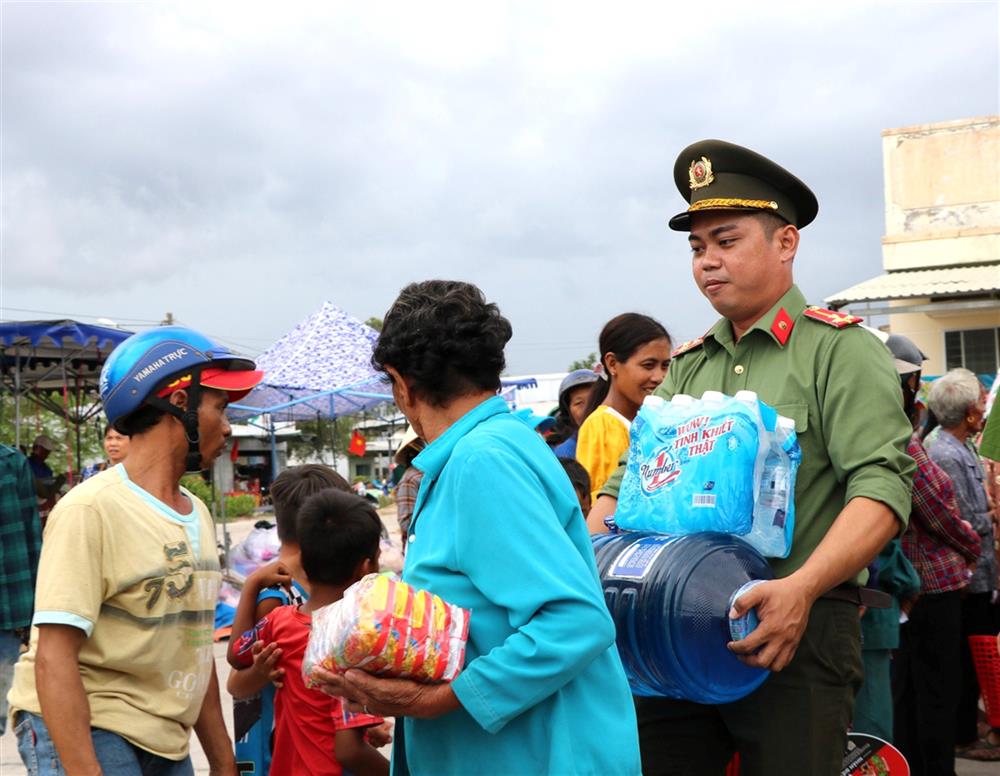 Cán bộ chiến sỹ Công an trao nước ngọt và nhu yếu phẩm tặng bà con nhân dân ở một số xã biên giới huyện Giang Thành.