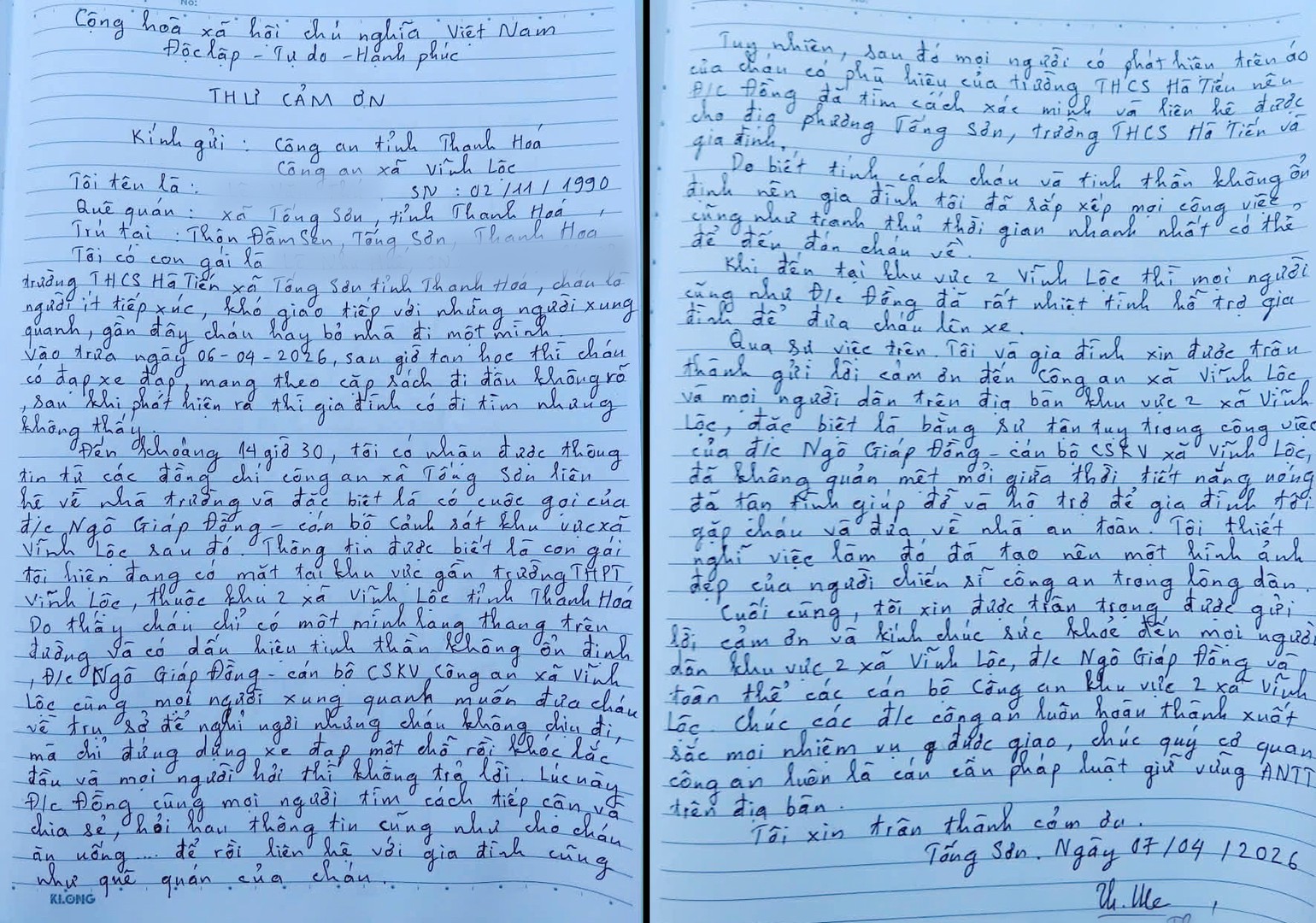 Những dòng thư cảm ơn chân thành của gia đình gửi tới bà con khu 2 và Công an xã Vĩnh Lộc, đặc biệt là Đại úy Ngô Giáp Đồng, không chỉ là lời tri ân, mà còn là sự khẳng định niềm tin của Nhân dân đối với lực lượng Công an, những người luôn sẵn sàng có mặt khi dân cần, hết lòng vì sự bình yên của cuộc sống.